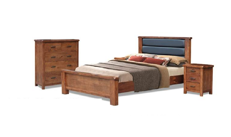 JAYDEN QUEEN 4 PIECE TALLBOY BEDROOM SUIT (3734) BED WITH PADDED HEADBOARD (MODEL - 7-5-15-18-7-9-1) - NUTMEG