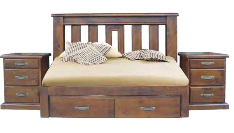 Mt. ISA QUEEN (2078) 3 PIECE BEDSIDE BEDROOM SUITE WITH 2 FOOTEND STORAGE DRAWERS - ROUGH SAWN