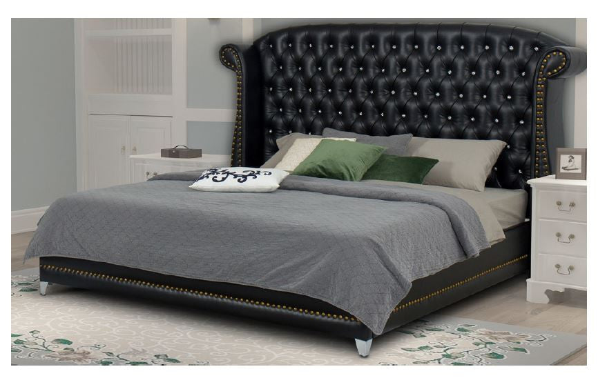 QUEEN VALENCE DESIGNERS LEATHERETTE UPHOLSTERED BED FRAME WITH TUFTED HEADBOARD - BLACK