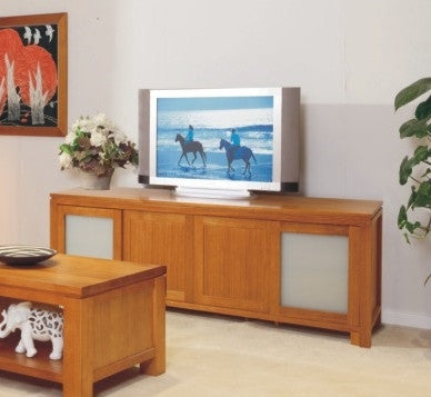 SUNNY LOWLINE TV UNIT WITH 4 SLIDING DOORS, SAFETY GLASS AND 4 DRAWERS BEHIND DOORS - 700(H) X 2000(W) - CHOICE OF COLOURS